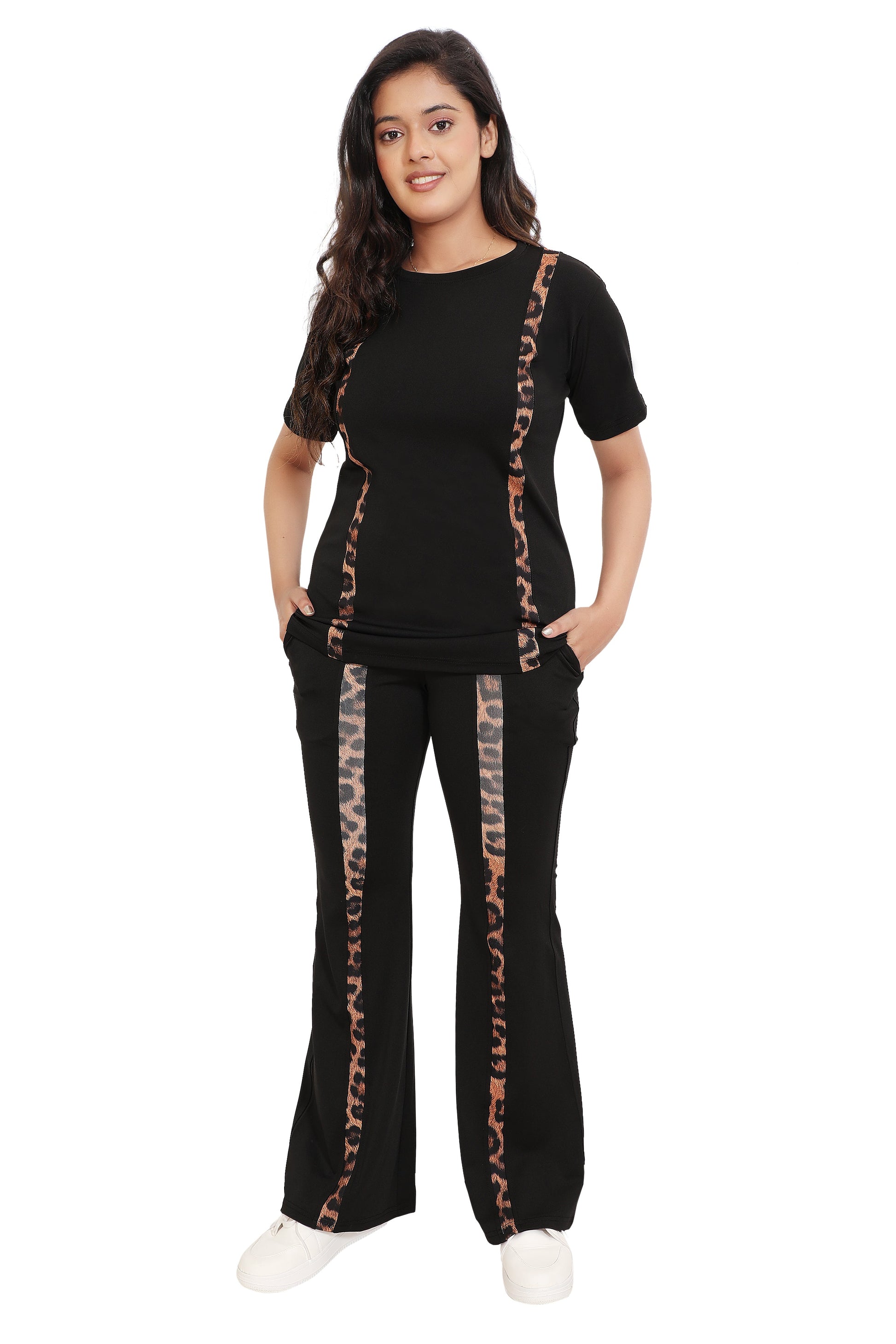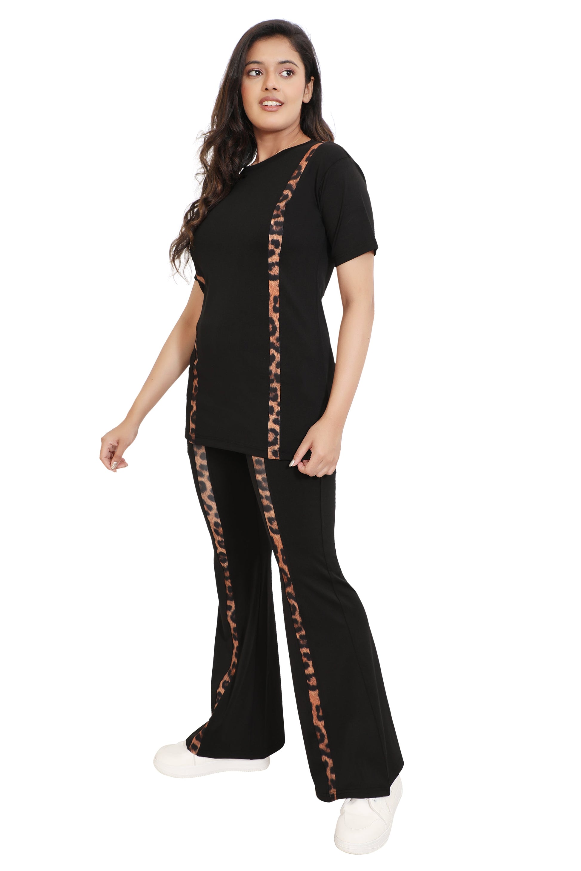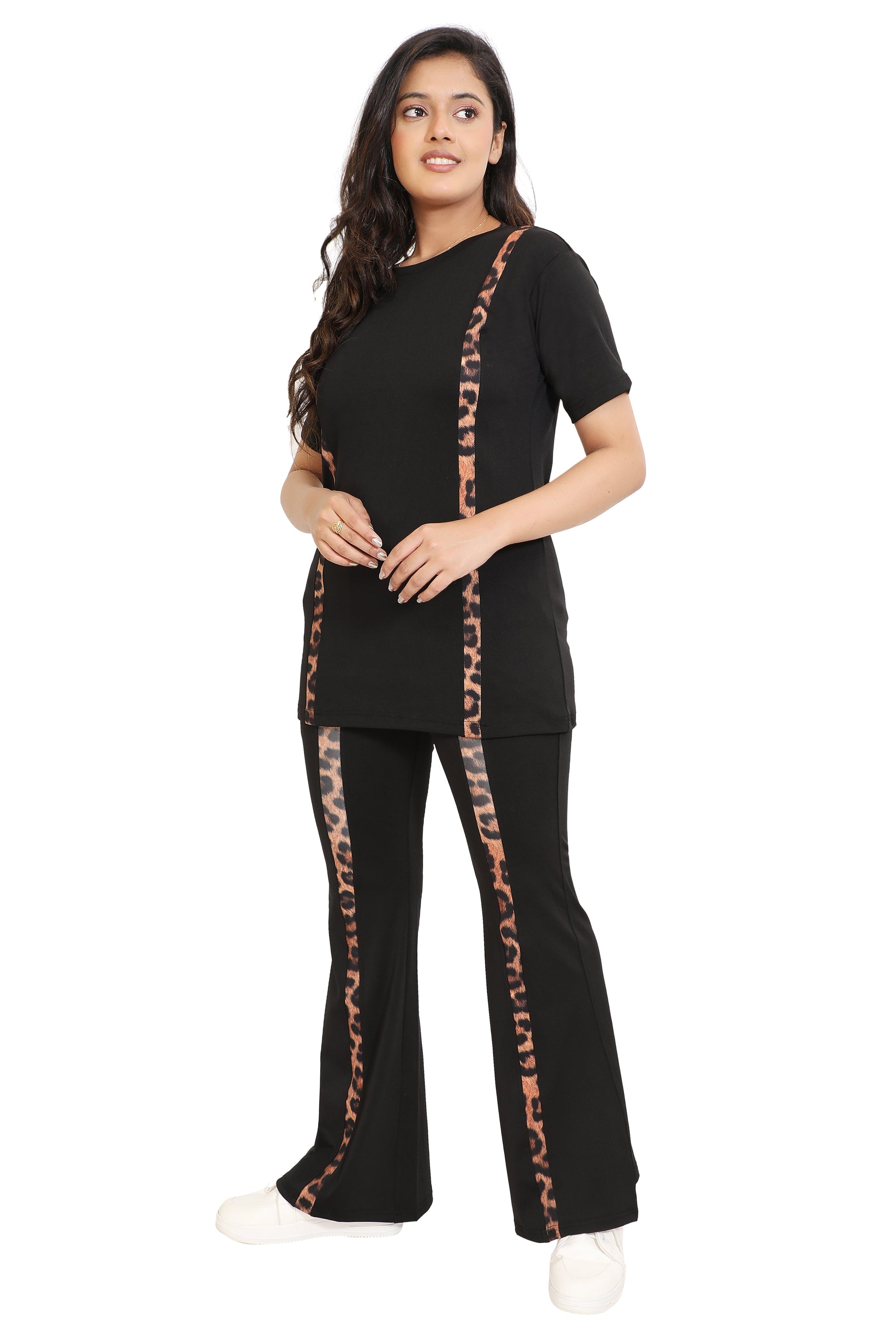 Women's Black Co-ord Set with Leopard Print Side Stripes